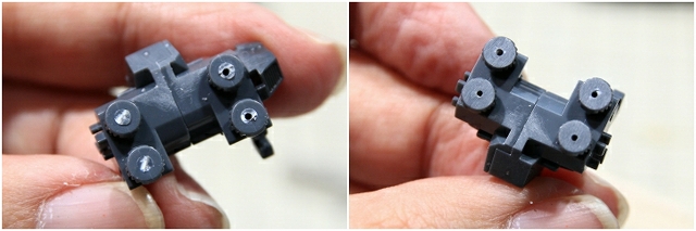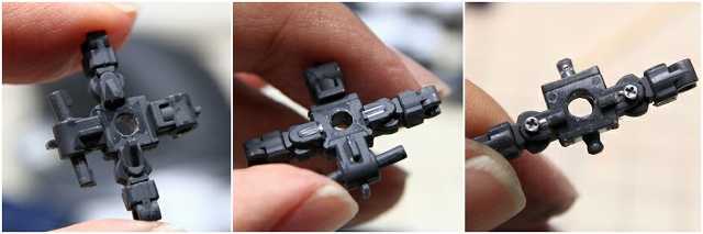 アドバンスドMSジョイントです。中央の穴は上半身との接続で、ここが抜けやすい。ネジやスペーサーで強化。