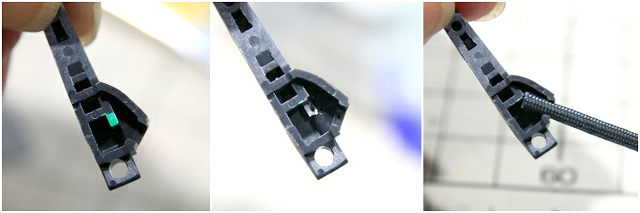 サーベルラックからの動力パイプ。キット取説では無理やり潰して固定する感じでした。内部をカットして自然な角度で固定できるようにしました。