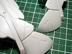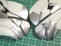 スジ彫りを入れていきます。左右対称も考えたのですが、元キットの羽根は複雑に絡み合っているのがとても気に入っているので、左右非対称、ランダムパターンにします。