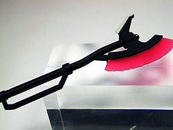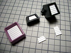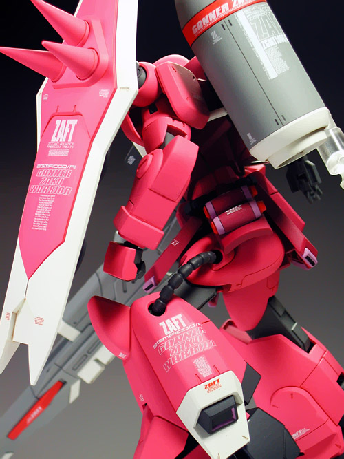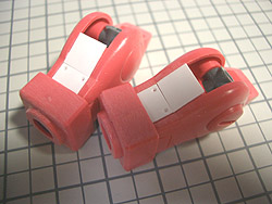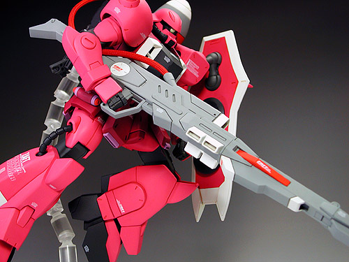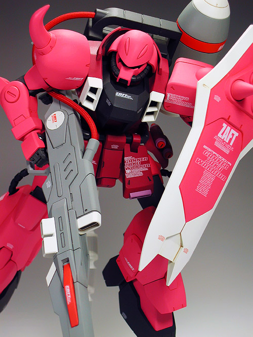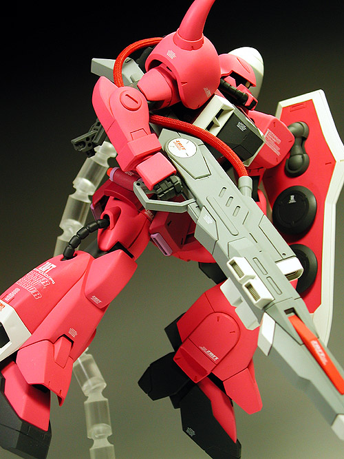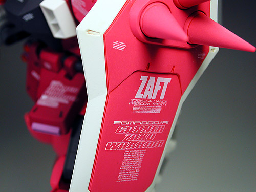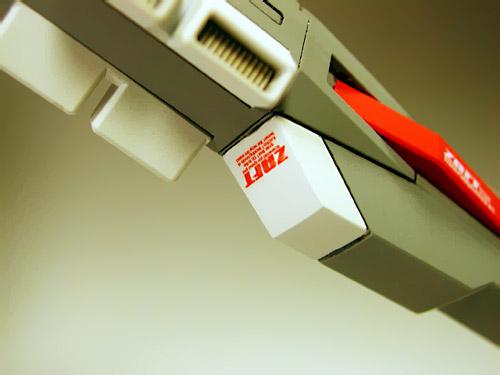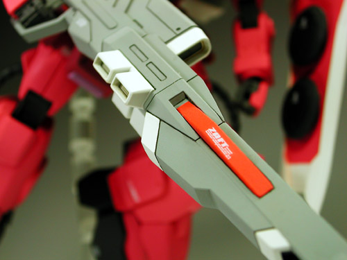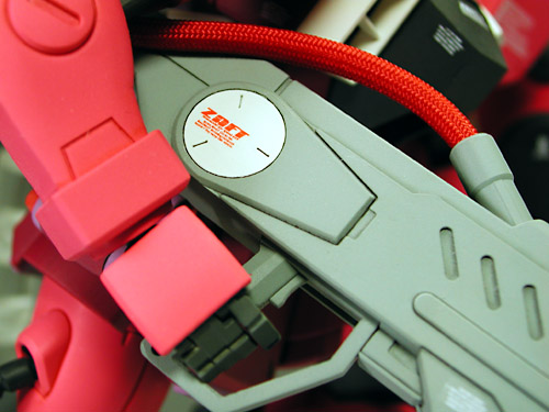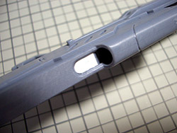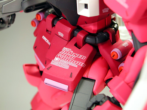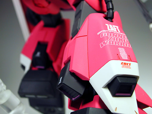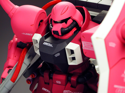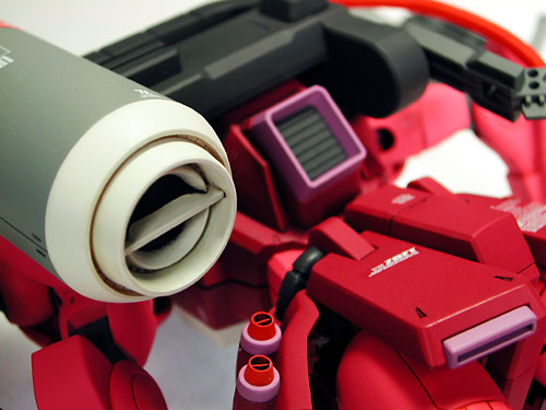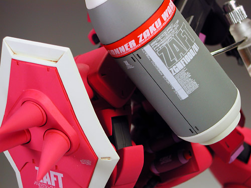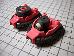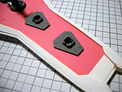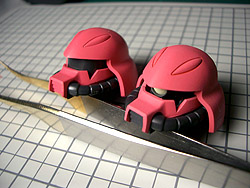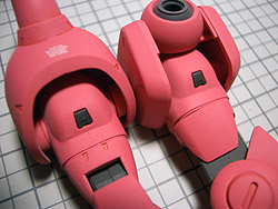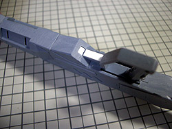 シールド裏側はマスキングにより塗り分け。 どちらも左がノーマル、右が改修後。軸受けを改造し、市販パーツで モノアイ&レールを新造。目つきも若干鋭くしました。 良く分かりにくい段落ちモールドだったので、 プラ板でパネルパーツ風に。 プラ板貼り貼り。 整流板のようなモールドにしました。