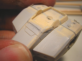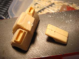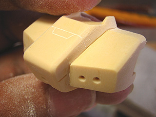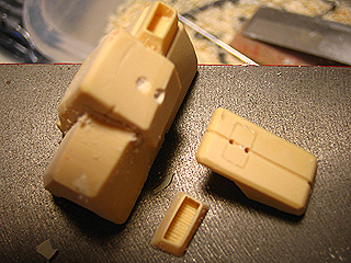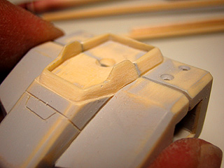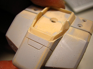 あ、脇腹のこのディテール、切り落として、凹面にして、コトブキヤさんのプラパーツに置き換えます。GKでは前面に2個しかないディテールですが、GFFでは前後左右4個あります。今回はGFF基調でしあげるので、このディテールを4つに増やしました。