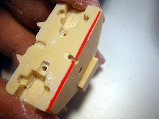 胸ブロックと背中ブロックの合わせ面。見えない部分ですが、マーカーで基準線を出してから面出し・クリアランス調整をしっかりやっておきます。