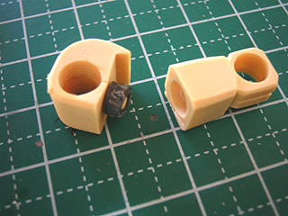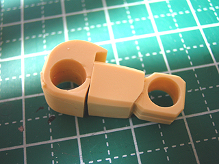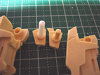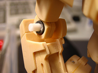 肘関節は、キットのパーツ分割は強度的に辛い分割になっています。まずはキレイな穴空け、軸棒の改修をします。