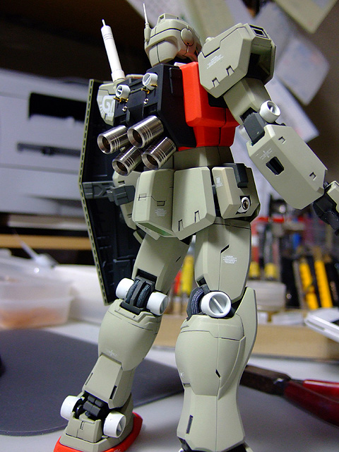 スキな機体、ジム改です。 昔はカラーバリエーションで何体も作った想い出があります。 今回はなんとなくセンチネルっぽいカラーを 作りたくて製作をはじめました。 可動は殺してませんが、素立ち優先で。完成目前で忙しくなっちゃって、しばらく休止してたのですが、 友達にプレゼントするために完成させました。
