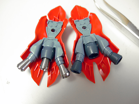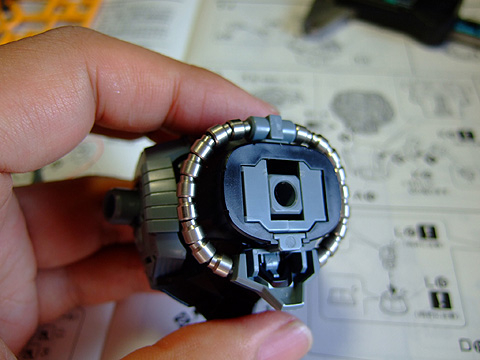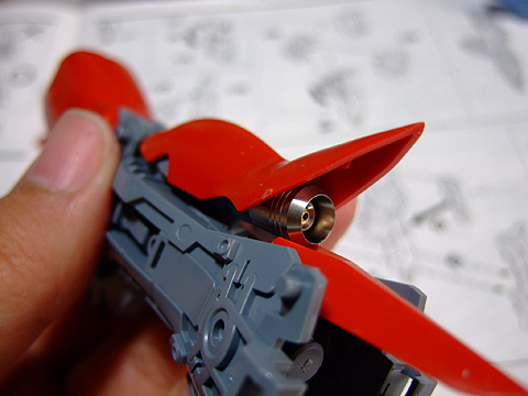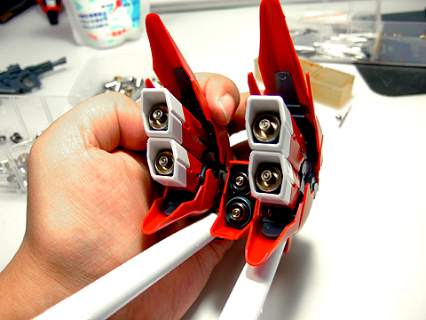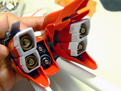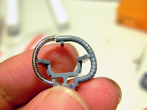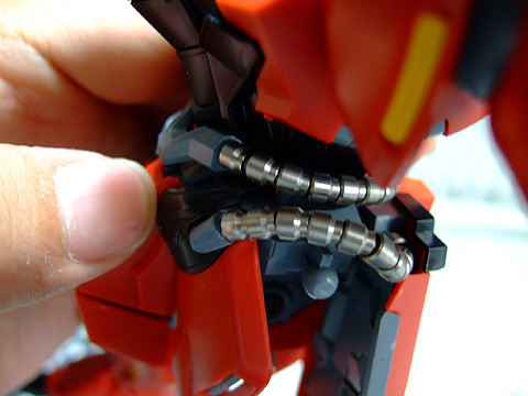 ジオン定番の動力パイプ。アポジ4mmがちょうど良いサイズです。キット付属のスプリングだとちょっとキツイかもしれないので、真鍮線などを芯にすればちょうど良いかも。個数は36個〜40個くらい使います。