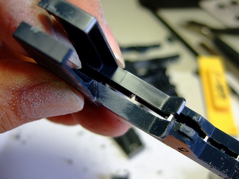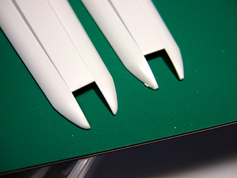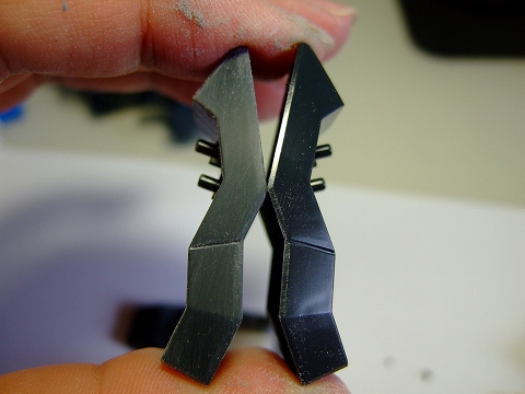 ここのパーティングライン(上)はけっこう目立ちます。組んでからではヤスリが当てにくいので、組む前に処理しましょう。下が処理済みです。