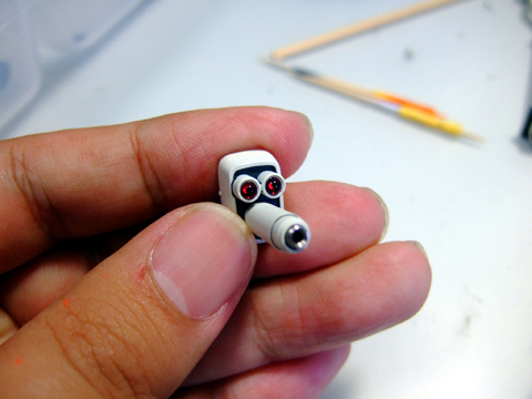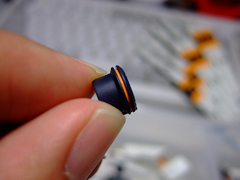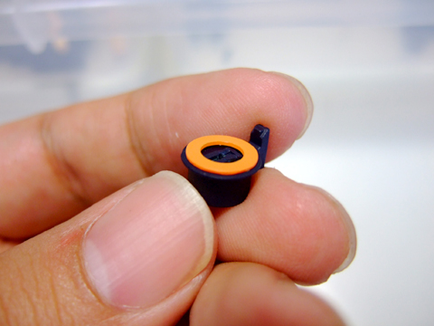 このキットパーツは青と黄色で塗り分けるのですが、黄色い部分が非常に小さいので塗り分けが難しいです。