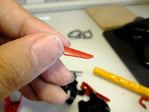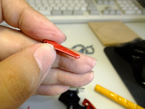 こういう小さい部品はランナーを残したまま加工&塗装すると良いです。