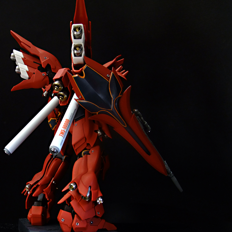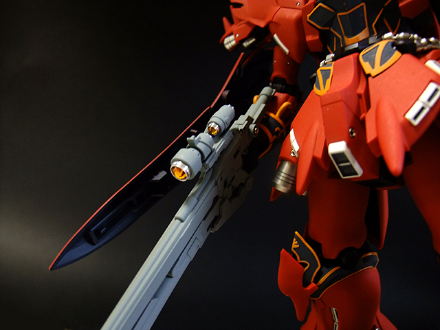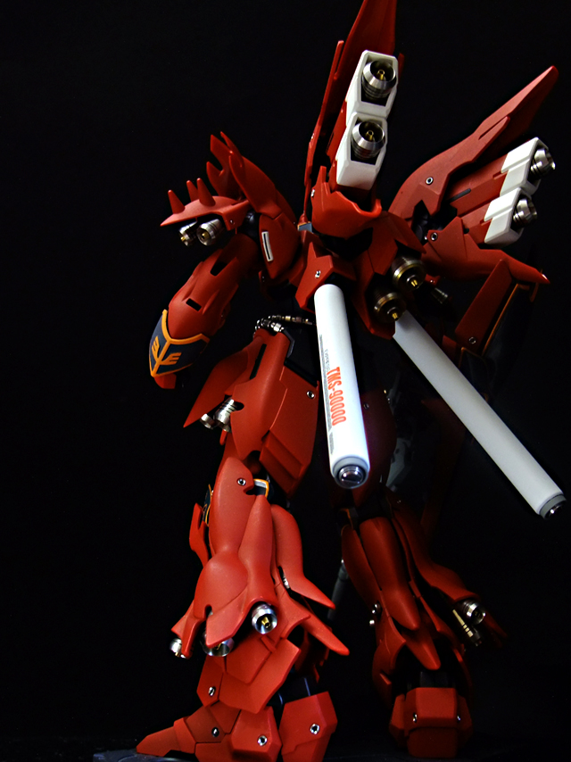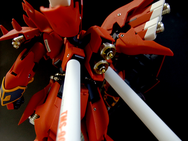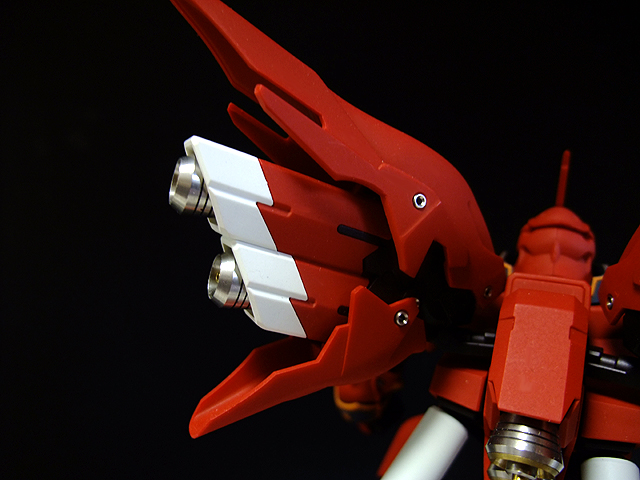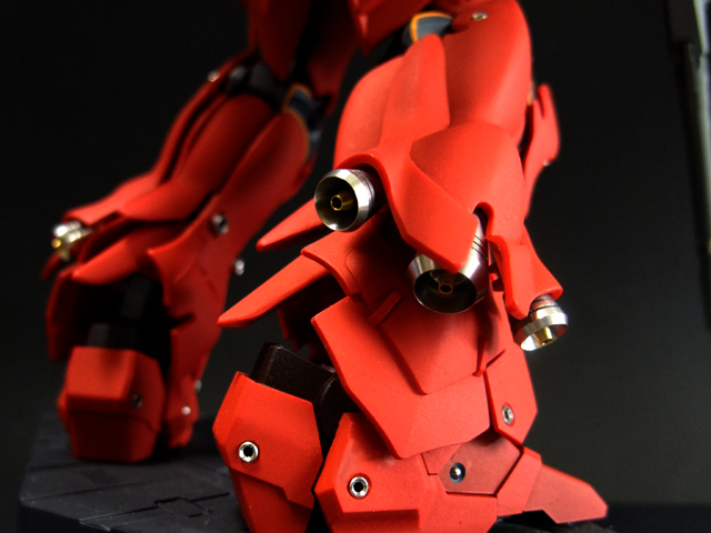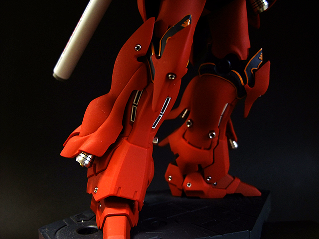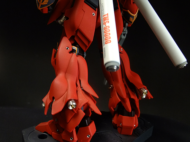 あ、そういえば書き忘れていましたが、今回も半固定ポーズでプロポーション重視で製作しました。MGシナンジュ同様、全体のパーツ数が多く重いキットです。とくに上半身とバックパックが重いので、腰・ヒザ・足首あたりの関節強度が足りず自立できません。まぁ気を使えば立たせることもできますが、あまり見栄えのよいポーズは取れません。製作される方は特に足首の弱さはなんらか対策した方がよいでしょう。
