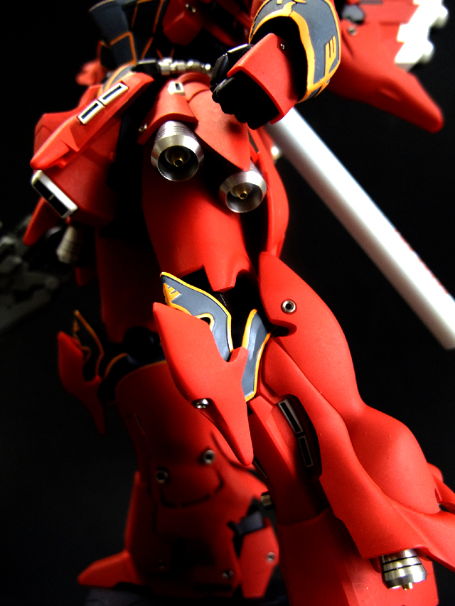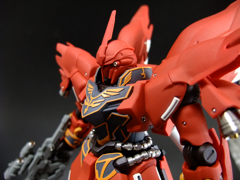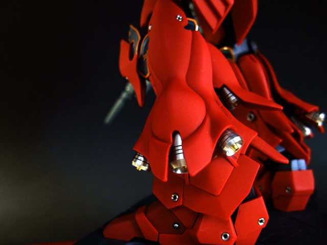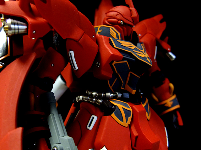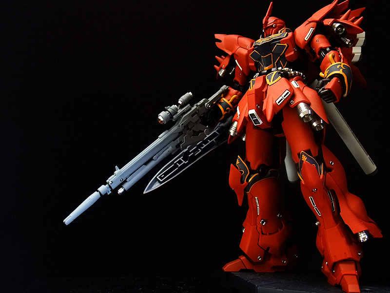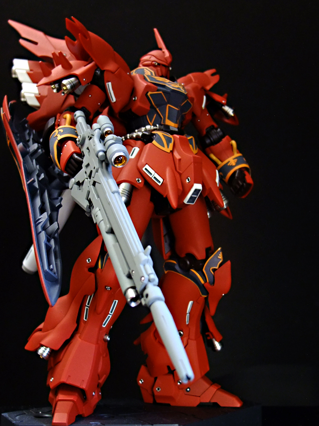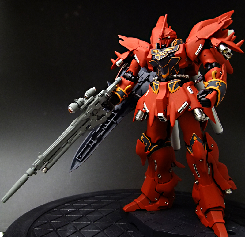 あ、そういえば書き忘れていましたが、今回も半固定ポーズでプロポーション重視で製作しました。MGシナンジュ同様、全体のパーツ数が多く重いキットです。とくに上半身とバックパックが重いので、腰・ヒザ・足首あたりの関節強度が足りず自立できません。まぁ気を使えば立たせることもできますが、あまり見栄えのよいポーズは取れません。製作される方は特に足首の弱さはなんらか対策した方がよいでしょう。