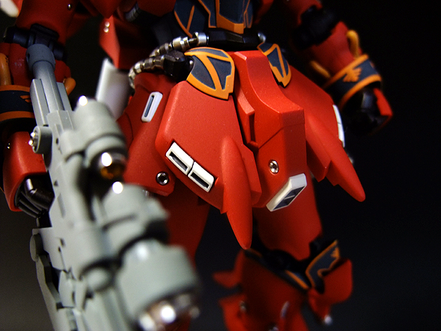 ジオン系の機体にしては面が狭く複雑、そこにメタルパーツを配置するとけっこうな情報量になるので今回はデカールは無しで仕上げてみました。