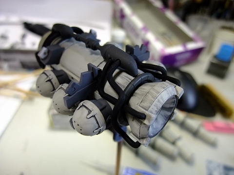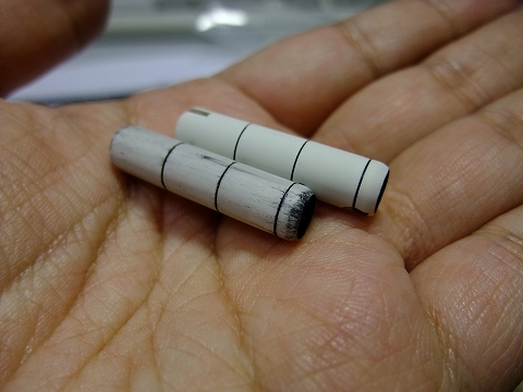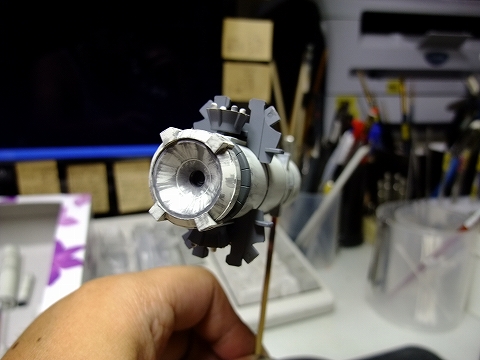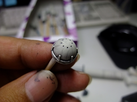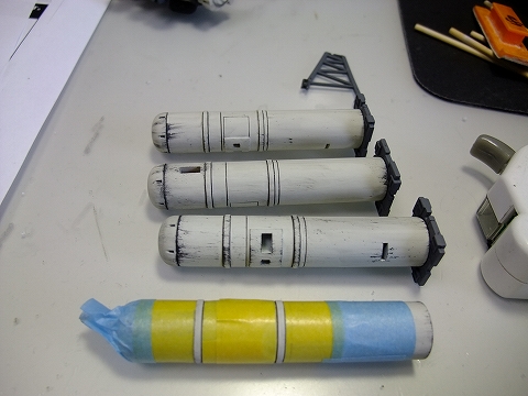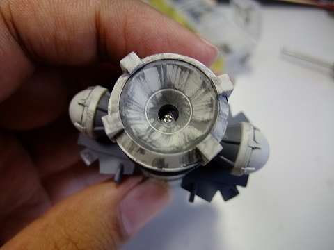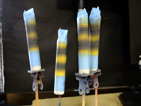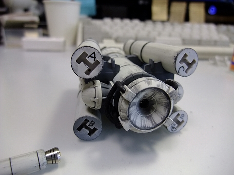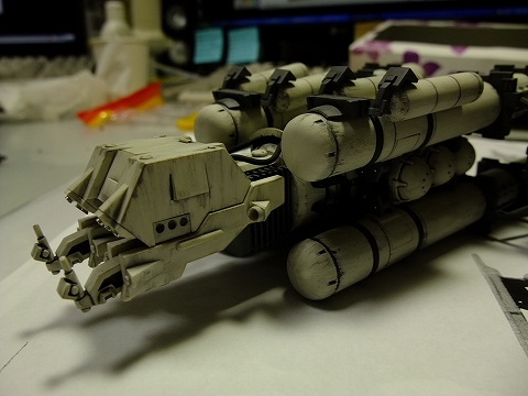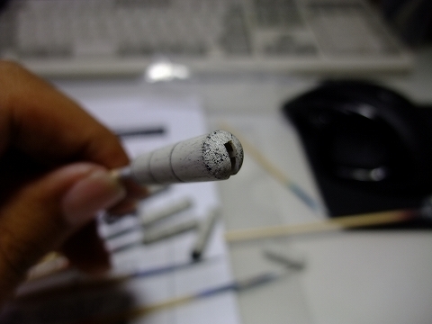 タンクの先端部。空気の流れを意識して、放射線状に汚れを入れます。