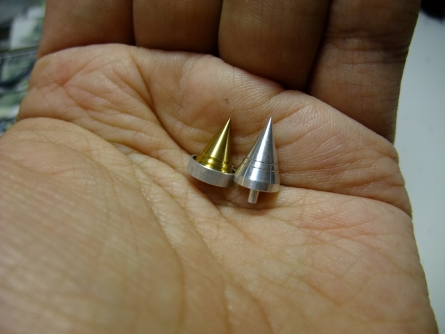 PPスパイク、左がAタイプ(真鍮)、右がBタイプ(アルミ)。