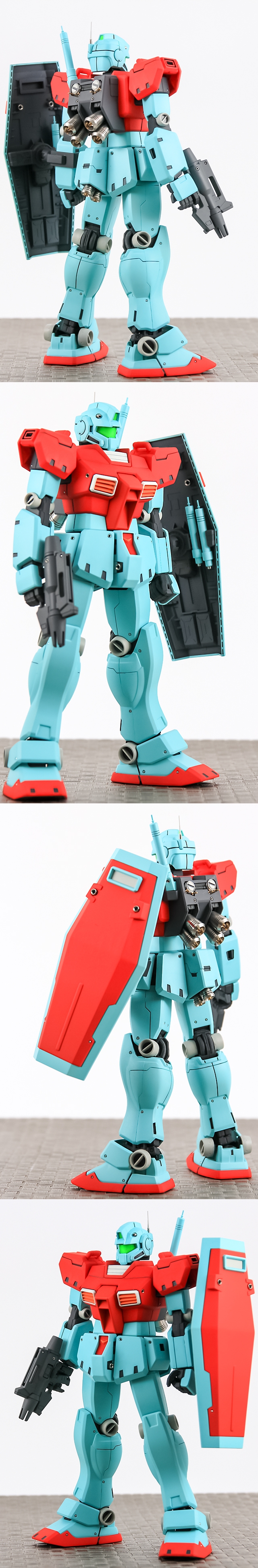ジムは好きな機体であり、かつ「量産型」ということでたくさんのバリエーションを定期的に作ってます。今回は「スタンダードカラー」と表記されてるカラーリングをベースに、一年戦争の「赤い肩」をアクセントとして追加しました。また本体のブルー・ホワイトは今回新たに調色しました。