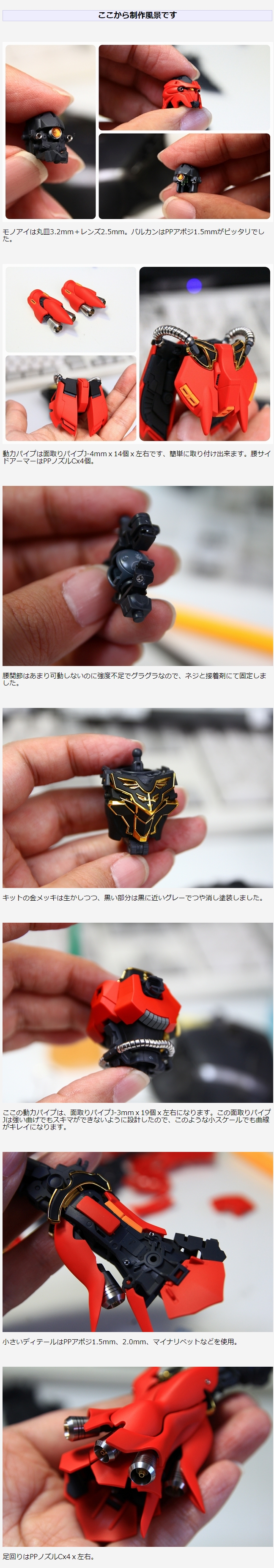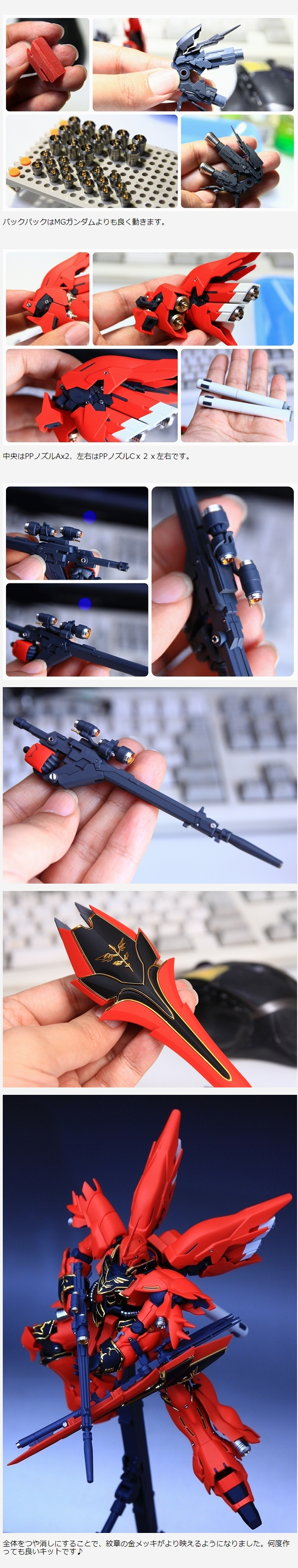 赤パーツの表面処理が異様にきれいなRGシナンジュですが、つや消し仕上げも好きなので今回は塗装で仕上げました。金メッキ部分だけはキットのままを生かしてます。また全身のディテールをメタルパーツに置き換えました。