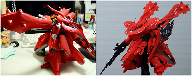 そういったわけでRE/100のキット素組はすぐに分解し、改造制作を開始。MGサザビーVer.1、MGサザビーVer.Ka、MGシナンジュ、その他ジオン系キットからパーツを流用したミキシングビルドを目指しました。