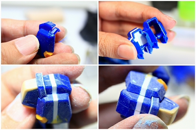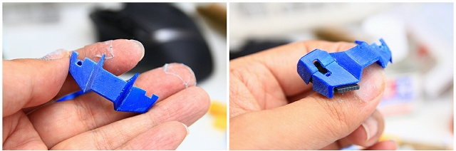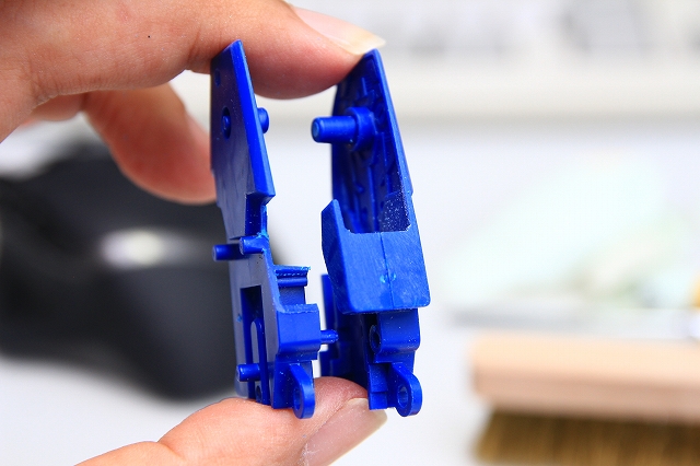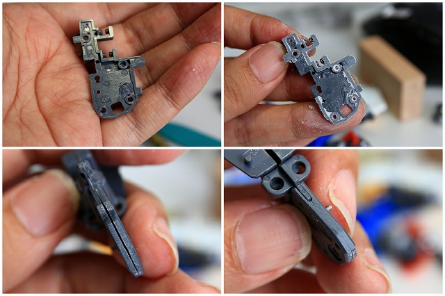 金型消耗のせいかパーツにすき間ができます。合わせ面の面研やスナップフィットのオミットなどですり合わせを行います。最終的には接着剤とネジで固定。