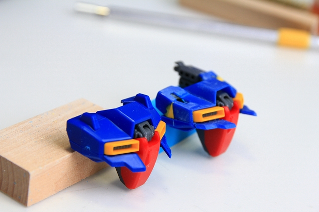 Ver.2.0やRGなどの最近のゼータはどんどんシャープで縦長になっていく風潮があって、設定画やアニメからは遠ざかってる面もありますが、それはそれで現代風スタイリッシュで良いと思います。それにWRの薄さも考慮するとMS形態に制限が出てしまうのは仕方がないこと。思い切って「MS形態固定でベストプロポーションのキット」が出たら嬉しいんですが、出そうもないので、自分で作ってみようかなと。