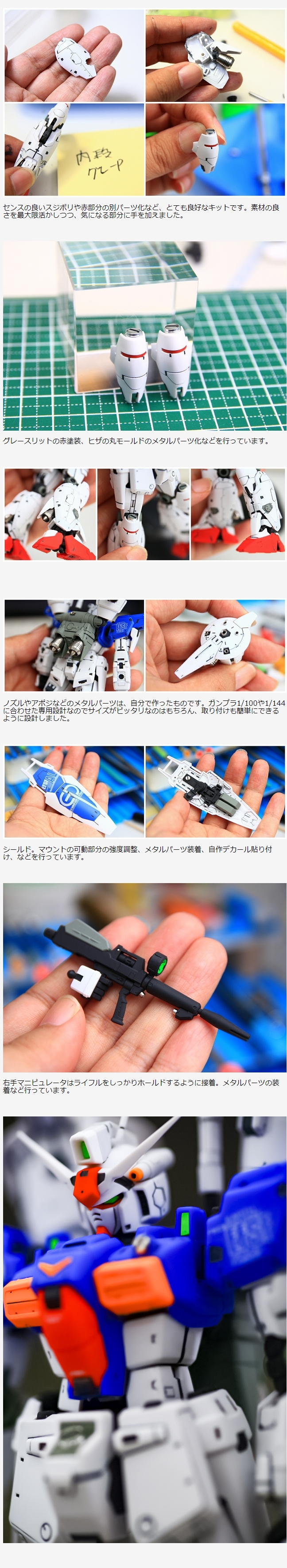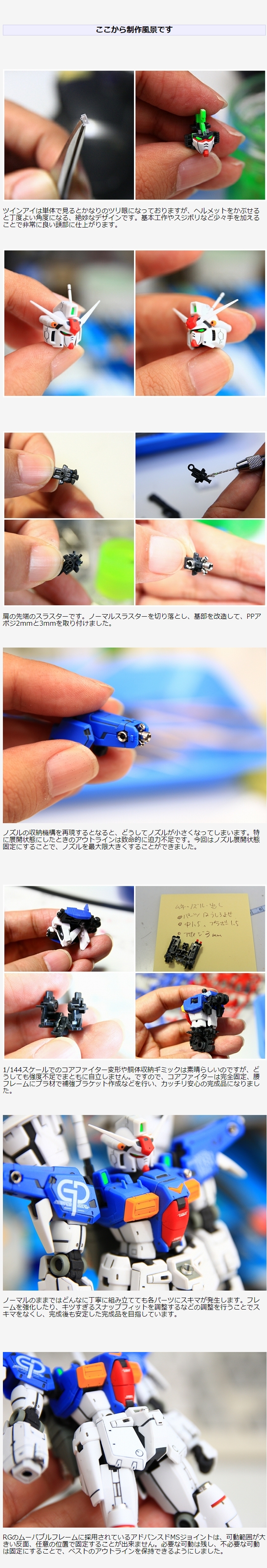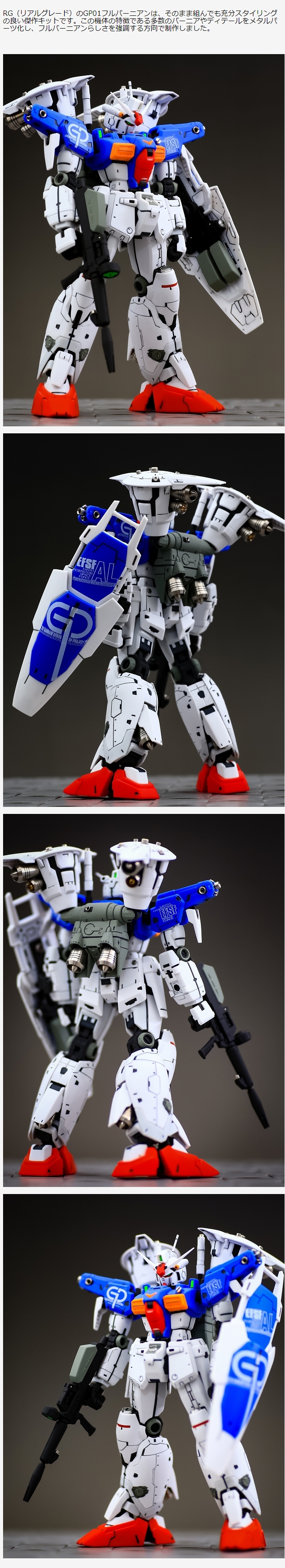 RG(リアルグレード)のGP01フルバーニアンは、そのまま組んでも充分スタイリングの良い傑作キットです。この機体の特徴である多数のバーニアやディテールをメタルパーツ化し、フルバーニアンらしさを強調する方向で制作しました。