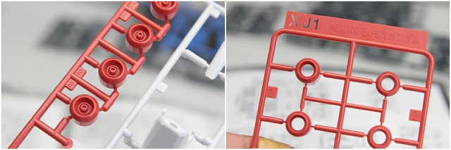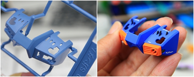左がVer1.0で一体成型の2パーツのモナカ割り。右がVer1.5でフレーム+赤パーツのパーツ構成、合わせ目はディテールで目立たなくなりました。