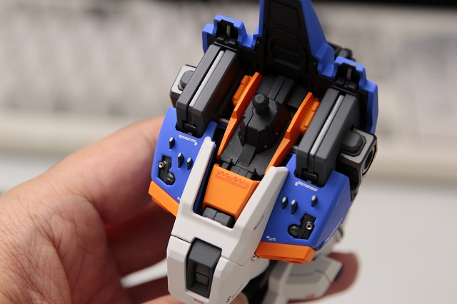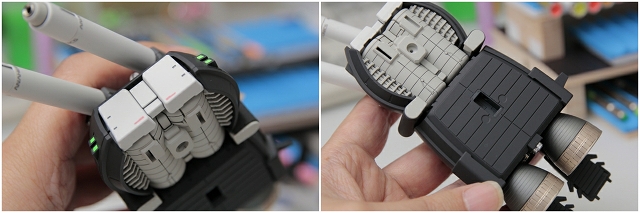 テールスタビマウント周辺。変形のために複雑な構成になっていますが、硬めのABSとラッチがあるので必要な固定力はあります。今回はMS形態固定なので、さらにネジ等を使って強固に固定。