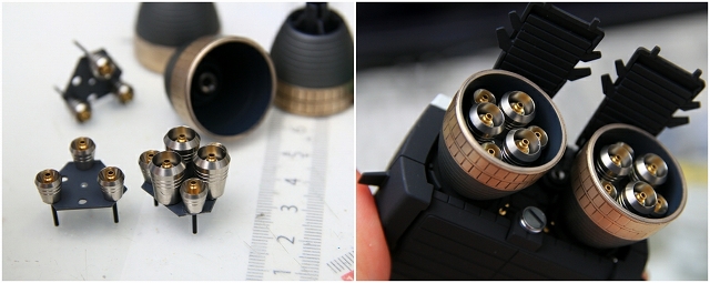 ノズル内部はキットのままでも悪くないモールドになっています。ここではプラ材でブラケットを作り、PPノズルBとノズルCを内装しました。