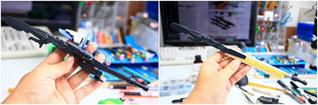 ディープストライカーのときは腰ワキ溜めだったので、すこし短めにアレンジしました。しかし今回はリファイン設定画のように胸の前で水平持ちをさせるので、長めにアレンジ。また「銃・ブラケット・腹マウント」の関係で左右位置がほぼ固定になる、銃底から重心の長さは決まっているので、それに合わせて重心からマズルの長さを決めました。