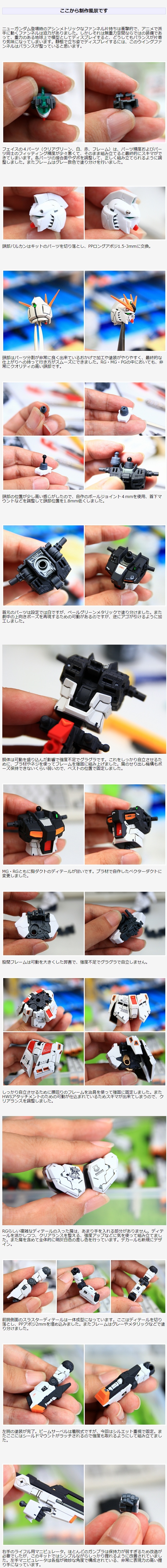 頭部はパーツ分割が非常に良く出来ているおかげで加工や塗装がやりやすく、最終的な仕上がりへの持って行き方がスムーズにできました。RG・MG・PGの中においても、非常にクオリティの高い頭部です。