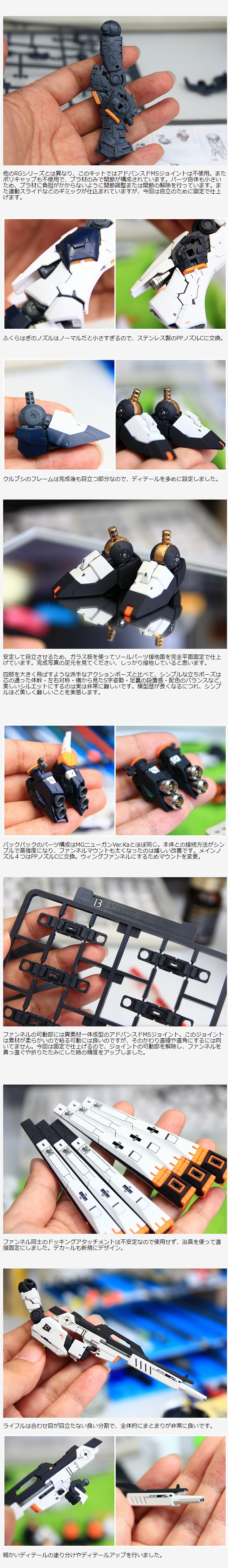 RGらしい複雑なディテールの入った肩は、あまり手を入れる部分がありません。ディテールを活かしつつ、クリアランスを整える、強度アップなどに気を使って組み立てました。また肩を含めて全体的に明灰白色の差し色を行っています。デカールも新規にデザイン。
