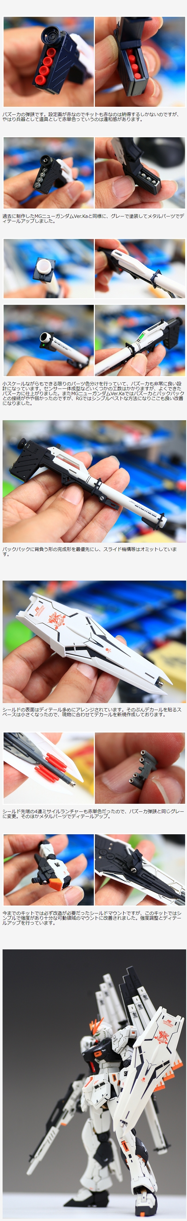 小スケールながらもできる限りのパーツ色分けを行っていて、バズーカも非常に良い設計になっています。センサー一体成型などいくつかの工数はかかりますが、よくできたバズーカに仕上がりました。またMGニューガンダムVer.Kaではバズーカとバックパックとの接続がやや弱かったのですが、RGではシンプルベストな方法になりここも良い改善になりました。