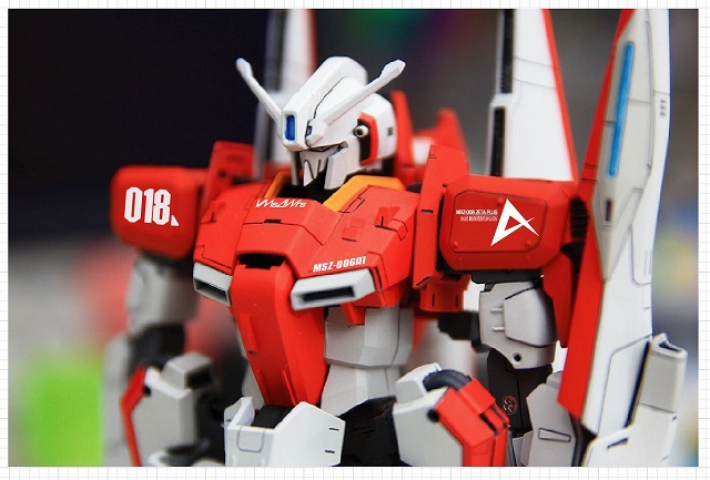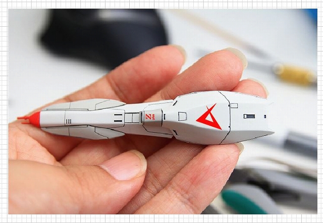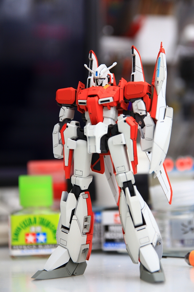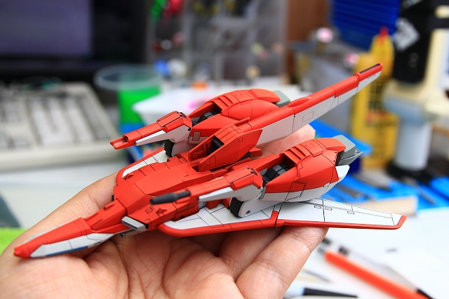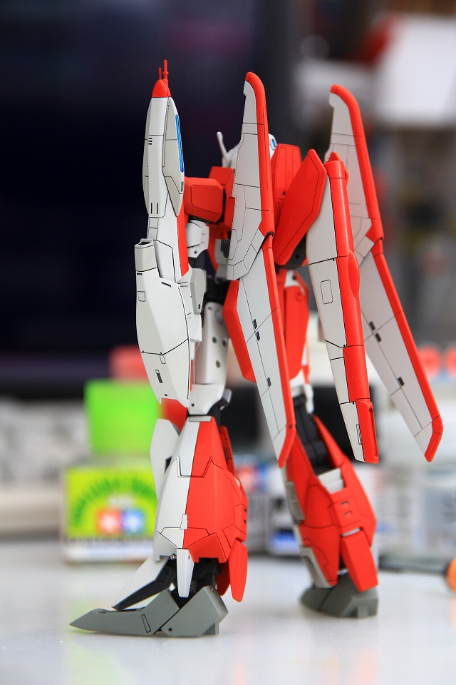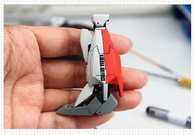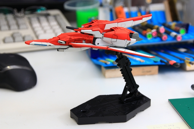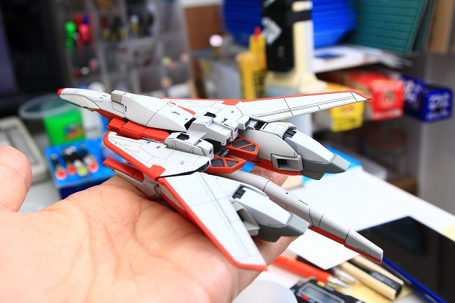 ここからWR塗装終了時点の写真です。細かいパーツはデカール貼りの後に取り付ける段取りです。いくつか見えているネジ頭は、完成後には隠れます。デカールはMSと共通ですが、MSとWRで根本的なパーツ造形が違う部位もあるので、それぞれ最適にアレンジします。