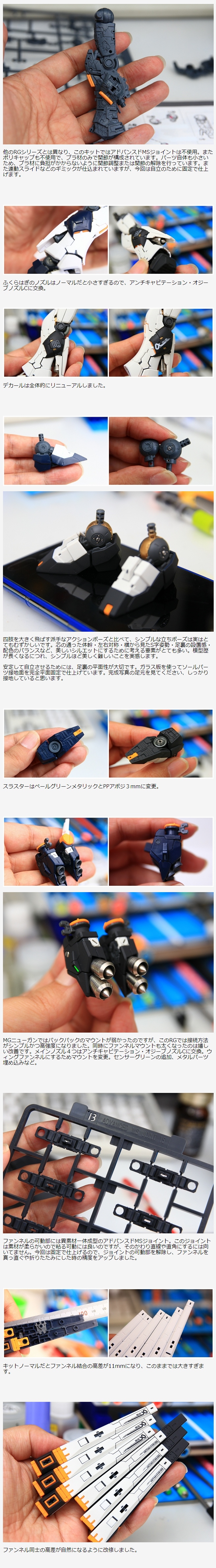 MGニューガンではバックパックのマウントが弱かったのですが、このRGでは接続方法がシンプルかつ高強度になりました。同時にファンネルマウントも太くなったのは嬉しい改善です。メインノズル4つはアンチキャビテーション・オジーブノズルCに交換。ウィングファンネルにするためマウントを変更。センサーグリーンの追加、メタルパーツ埋め込みなど。