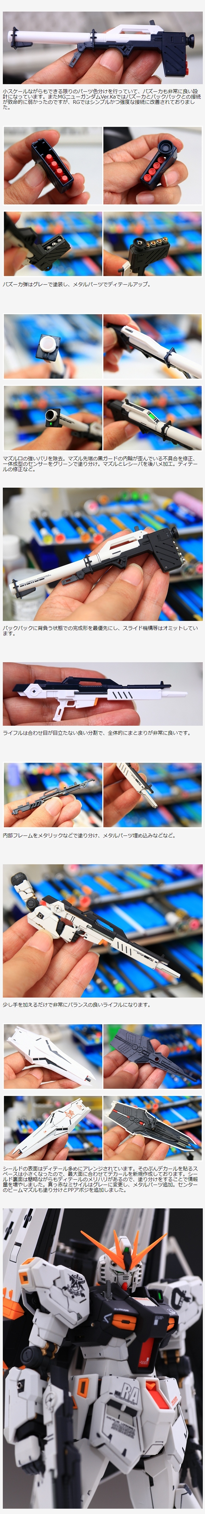 小スケールながらもできる限りのパーツ色分けを行っていて、バズーカも非常に良い設計になっています。またMGニューガンダムVer.Kaではバズーカとバックパックとの接続が致命的に弱かったのですが、RGではシンプルかつ強度な接続に改善されておりました。