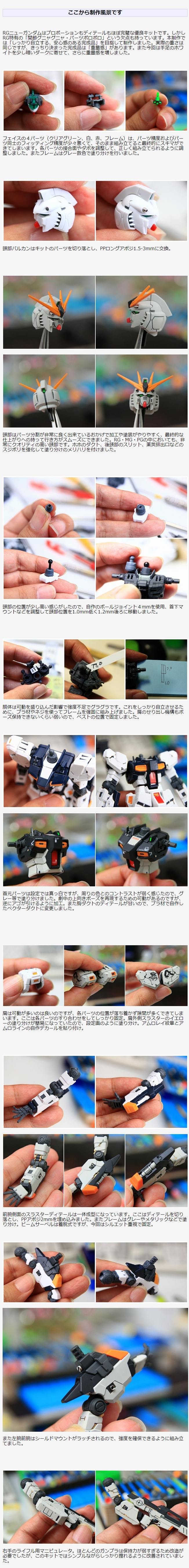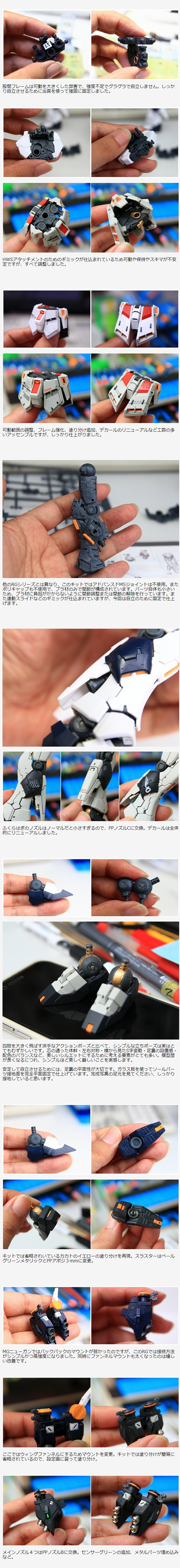 頭部はパーツ分割が非常に良く出来ているおかげで加工や塗装がやりやすく、最終的な仕上がりへの持って行き方がスムーズにできました。RG・MG・PGの中においても、非常にクオリティの高い頭部です。ホホのダクト、後頭部のスリット、薬莢排出口などのスジボリを強化して塗り分けのメリハリを付けました。