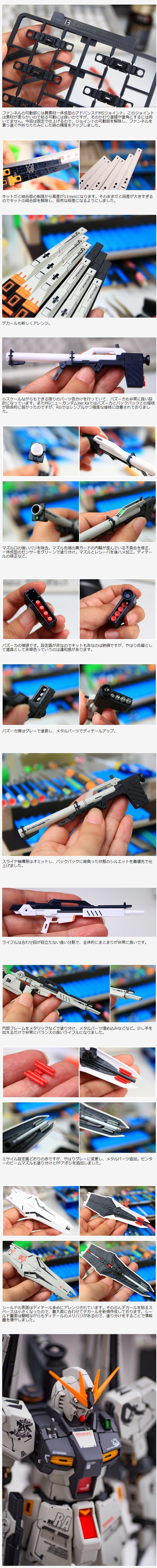 RGニューガンダムはプロポーションもディテールもほぼ完璧な優良キットです。しかしRG特有の「関節グニャグニャ・パーツポロポロ」という欠点も持っています。本制作では「しっかり自立する、安心感のある完成品」を目指して制作しました。実際の重さは同じですが、きっちり決まった完成品は「重量感」があります。また今回は手足のホワイトを少し暗いダークに寄せて、さらに重量感を増しました。
