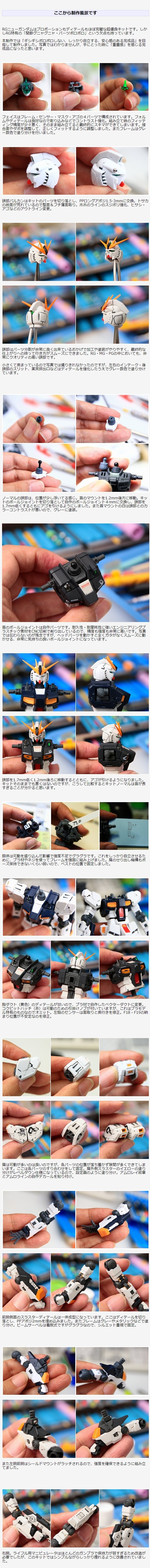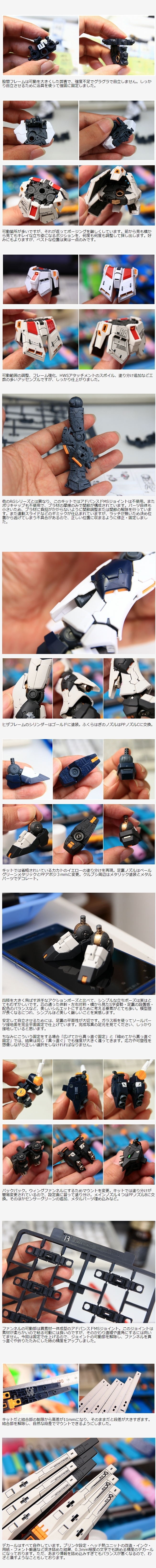他のRGシリーズとは異なり、このキットではアドバンスドMSジョイントは不使用。またポリキャップも不使用で、プラ材の摩擦のみで関節が構成されています。パーツ自体も小さいため、プラ材に負担がかからないように関節調整または関節の解除を行っています。また連動スライドなどのギミックが仕込まれていますが、ラッチが無いため決め位置から逃げてしまう不具合があるので、正しい位置に収まるように修正・固定しました。