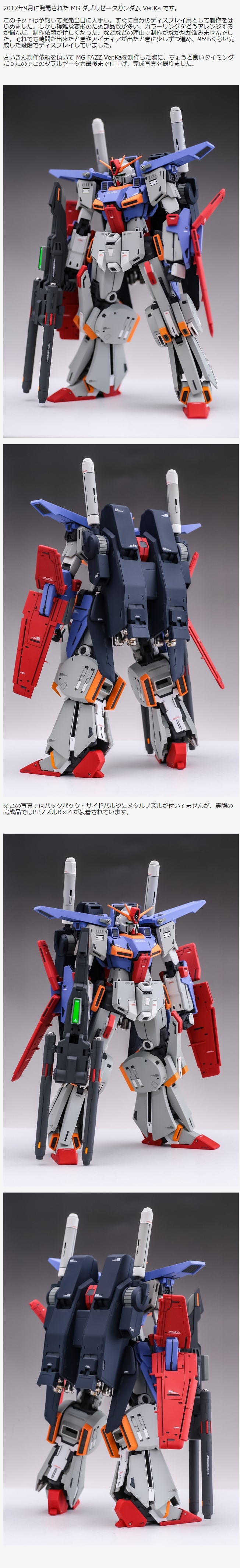 さいきん制作依頼を頂いて MG FAZZ Ver.Kaを制作した際に、ちょうど良いタイミングだったのでこのダブルゼータも最後まで仕上げ、完成写真を撮りました。