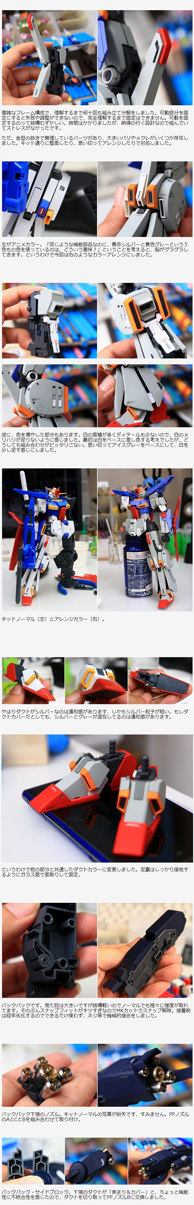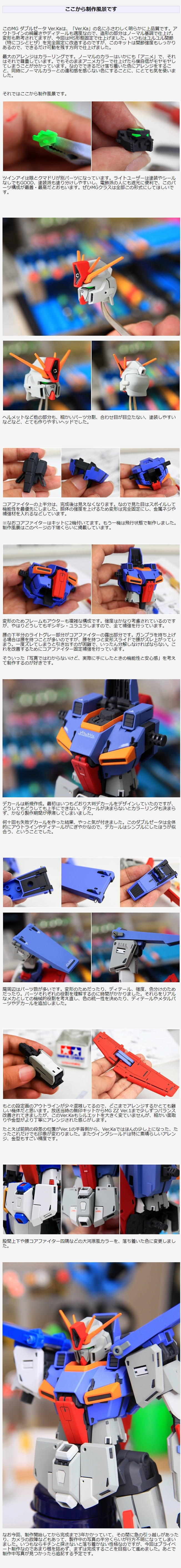 このMG ダブルゼータ Ver.Kaは、「Ver.Ka」の名にふさわしく明らかに上品質です。アウトラインの綺麗さやディテールも適度なので、造形の部分はノーマル基調で仕上げ。変形も熟考されてますが、今回はMS形態固定で仕上げました。いつもはユルユル関節(特にコシとヒザ)を完全固定に改造するのですが、このキットは関節強度もしっかりあるので、できるだけ可動を残す方向で仕上げました。