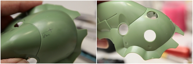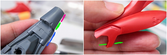 首元フレームをピンク・緑・青の3つに分割し、パーツ干渉を改善します。頭部位置を下げるため、ヘルメットのチンガードもカットします。