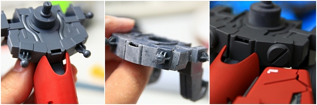 股間中央です。取付角度を変更し、上半身や頭部やライフルと平行になるようにしました。全身に数箇所あるダクトは、今回は白とグレーと黒の塗り分けで統一しました。