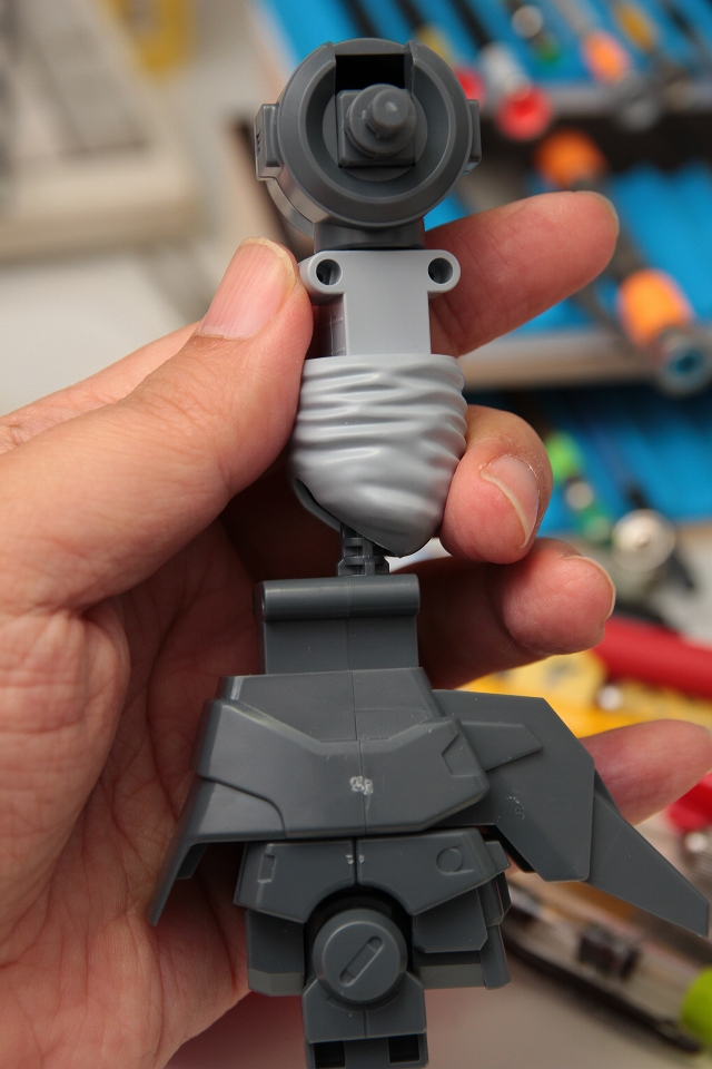 首のフレームもカットして頭部の高さを下げます。もともと首のジョイントがゆるく頭部の保持がグラグラなので、後頭部を支えるサポートを新設。