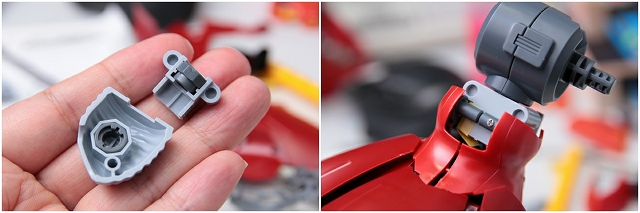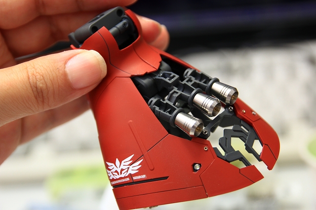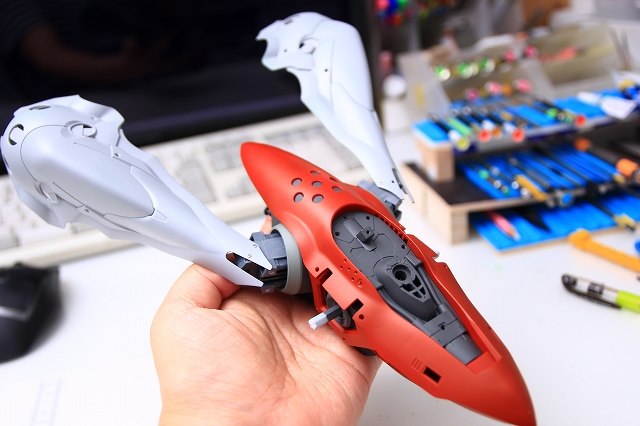 MGやRGだとフレームを詰め込むので重くなりがちですが、RE100は軽量というのはこの場合大きいメリットです。しかしER100は組み立て方法も簡易のため、何度も組み立て分解をする制作がやりにくい。後ハメできるようにしたり、スナップや接着ではなくネジで固定できるように加工しました。