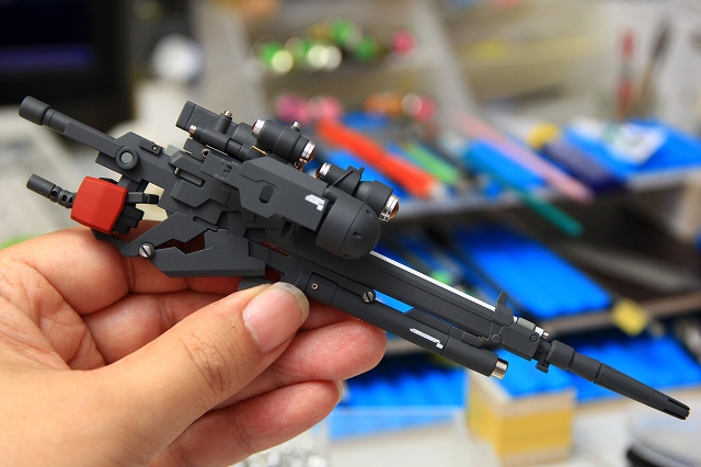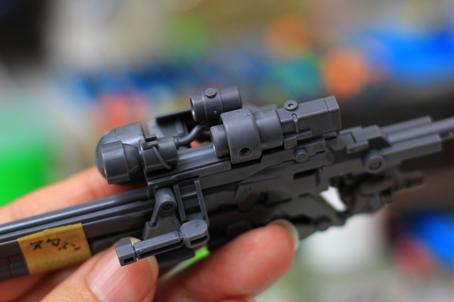 こちらはノーマルのライフル。元デザインとはぜんぜん違うアレンジだったりモナカ割りなのはRE100なので納得です。でも全ガンプラ共通の鬼門である「ちゃんとグリップできない、重底が干渉して構えられない」は、改善しないとどうにもなりません。