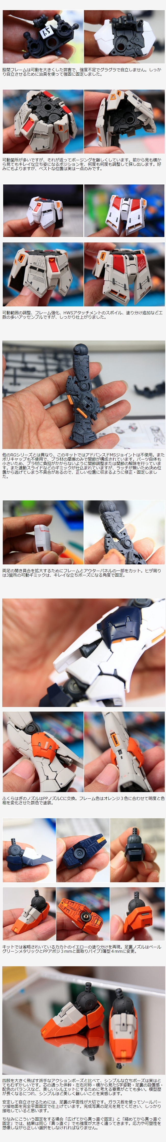 他のRGシリーズとは異なり、このキットではアドバンスドMSジョイントは不使用。またポリキャップも不使用で、プラ材の摩擦のみで関節が構成されています。パーツ自体も小さいため、プラ材に負担がかからないように関節調整または関節の解除を行っています。