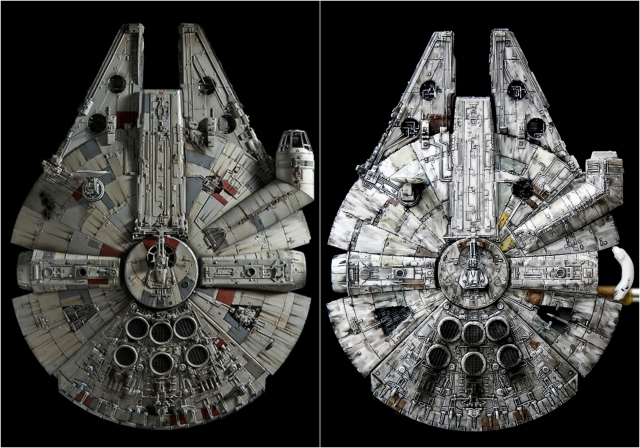 左はバンダイさんのサイトから「パーフェクトグレードPGファルコン」の写真をお借りしました。再現性は左のPGが正しいのでしょう。でも僕のファルコンは右くらい汚れてるイメージです。ちなみにスケールは1/72と1/350です。