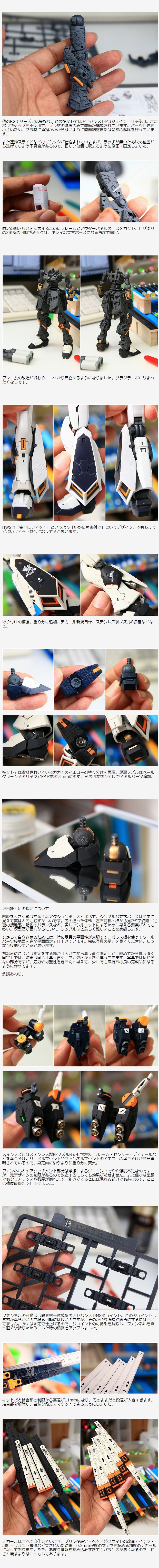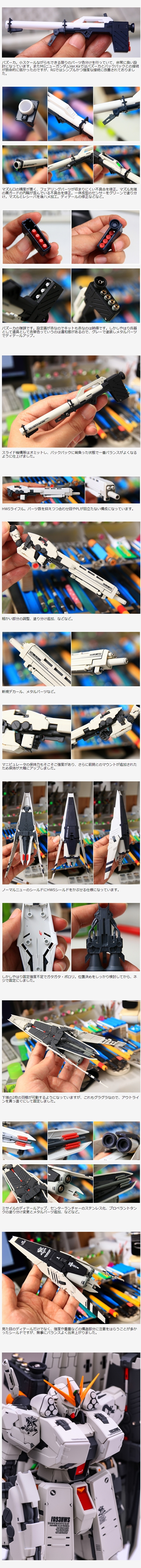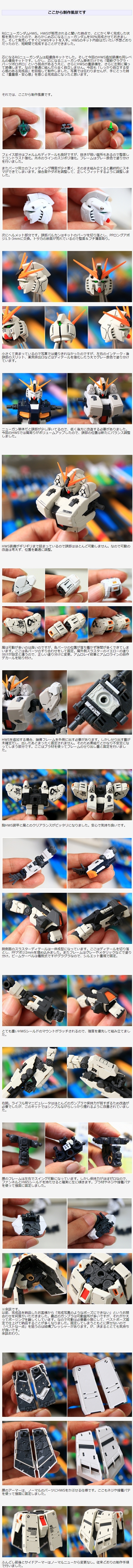 芯になるRGニューガンダムは超優良キットでした。そして今回のHWS追加装備も同レベルの優良キットです。しかし、芯になるニューガンダム単体だけでも「関節グラグラ・パーツポロポロ」という弱点があるうえに、さらにHWSの重装備を、さらに左側に偏って装備します。なので普通に組んだら全く自立しません。今回も「しっかり自立する安心感のある完成品」を目指して制作しました。写真では伝わりませんが、手にとった時に「重量感・安心感」を感じる完成品になったと思います。