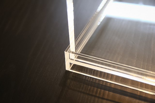サイズがピッタリで気持ちいいです。厚さは3mmで安心の強度。重さも心地よいです。驚いたのはアクリルの質の高さです。透明度が高く、小口や接着の処理もキレイ。角は全部面取りしてあるので手触りも良い。市販のアクリルケースよりも明らかに品質が良いです。シンプルかつとても良いディスプレイケースが手に入りました。