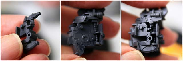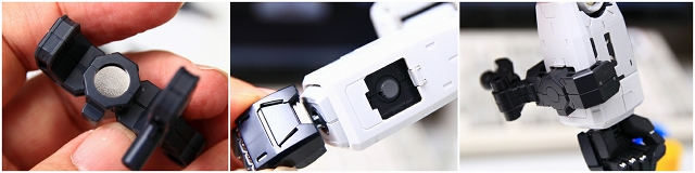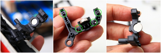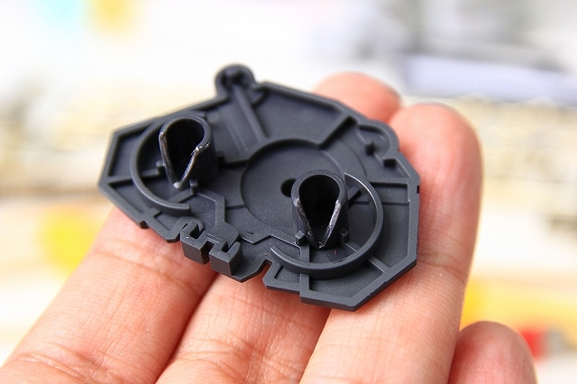 シールドと左腕を接続するためのマグネットです。この部分は(誤飲防止とかの安全基準のためか?)組立済状態でキットに入っています。このままだとヤスリや塗装がやりにくいので分解します。4つのツメで固定されてるのでツメを解除するのが理想ですが、実際にはツメを外すのは困難です。やや強引ですがコジあけるのがベストです、丁寧にやればまったく傷つきません。分解が怖い場合は、分解しなくても大丈夫です。マスキングなどすればヤスリも塗装も可能です。