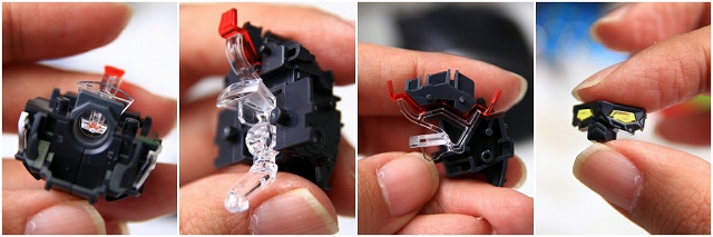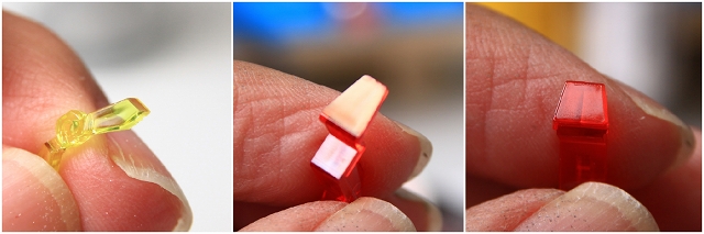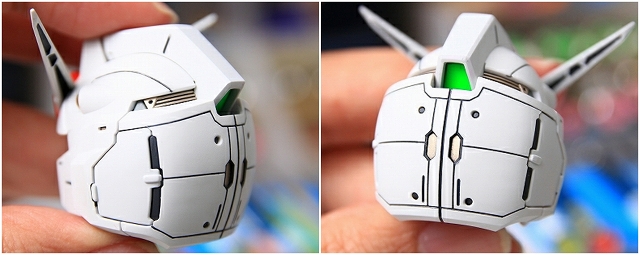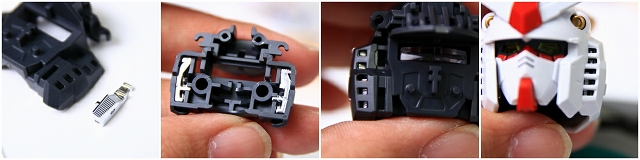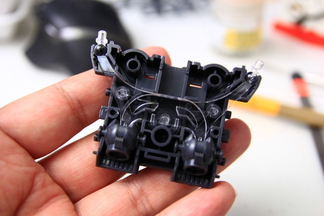 LEDの光を伝えるための導光管の役割をするクリアーパーツ。それぞれ分岐して、頭部ツインアイ・額センサー・後頭部センサーに光が分配されます。ただ、この構造だと光のロスと分配率が悪すぎて、十分な光量が得られるのか心配です。