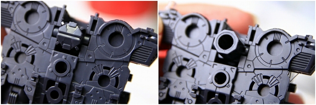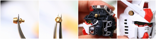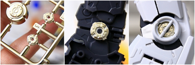ガンプラでは初(?)のメタルディテール。取り付け方法に凝ってフランジなどを設けたのはいいのですが、その代償として奥行がまったくなく、穴底が丸見えで、せっかくのメタルパーツの効果が出てません。内側を黒で塗って、メタルパーツ(PPアポジ1.5mm)を埋め込む予定です。